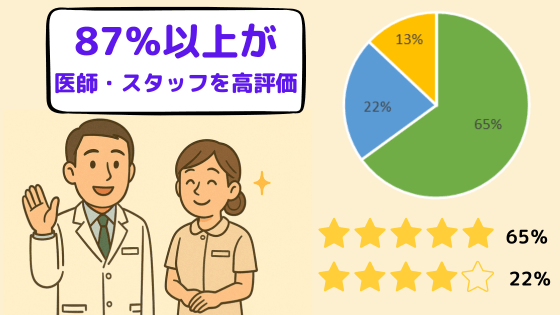 医師・スタッフの対応 | 4.5 | 医師・スタッフの対応が親切丁寧、説明が分かりやすいと好評。 |