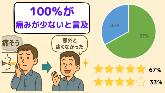 さらに、施術前は「痛みが不安」と心配していた人も実際施術を受けて「痛みがほとんどなかった」「耐えられる痛み」とコメントしています。