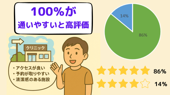 通いやすさ | 4.9 | 駅近でアクセスが良い、予約制で待ち時間も少ない、院内が清潔で居心地が良いなど通いやすさは非常に高評価。 |