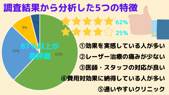 効果や痛み | 4.5 | 施術回数(2回~10回以上)には個人差があるが効果を実感している人が多数。 痛みが少ない・耐えられる痛さとのコメントが見受けられた。 |